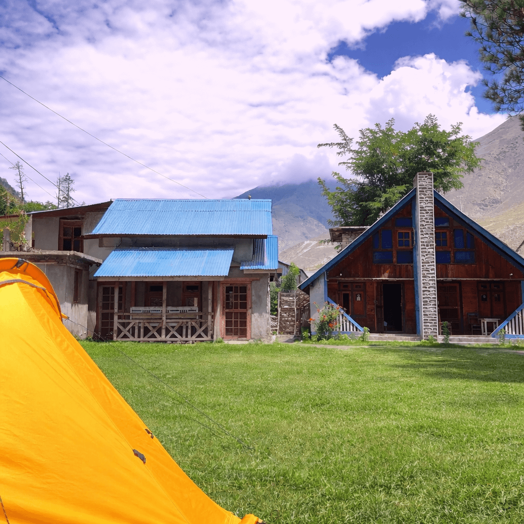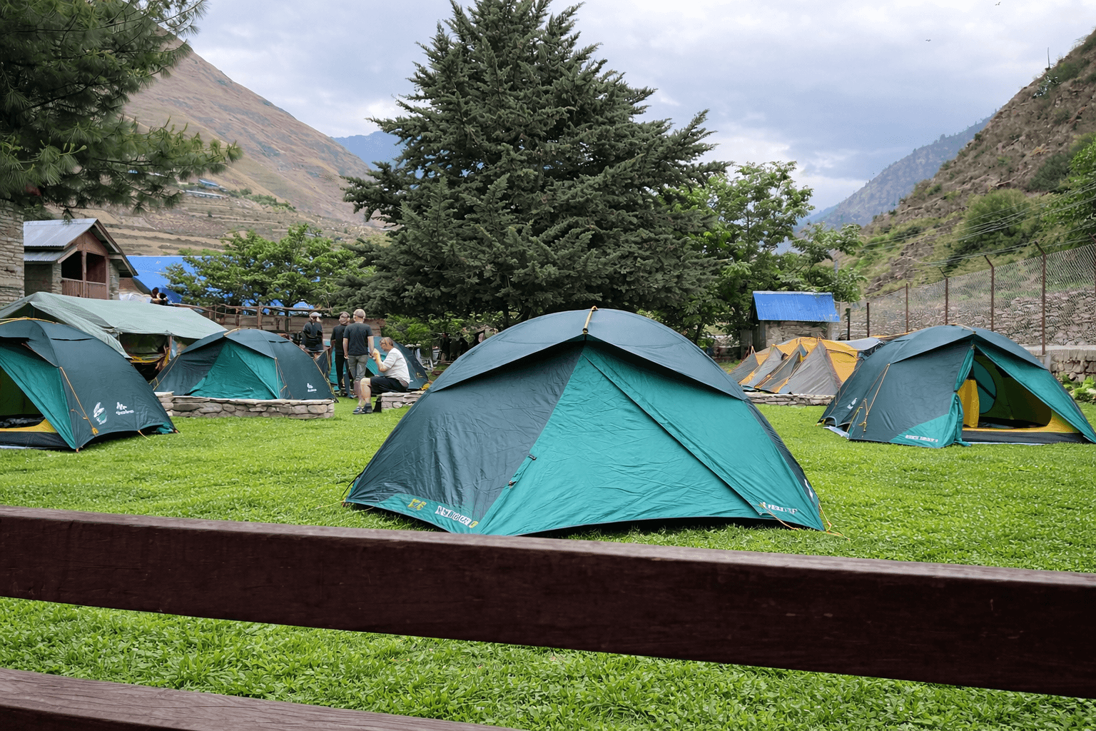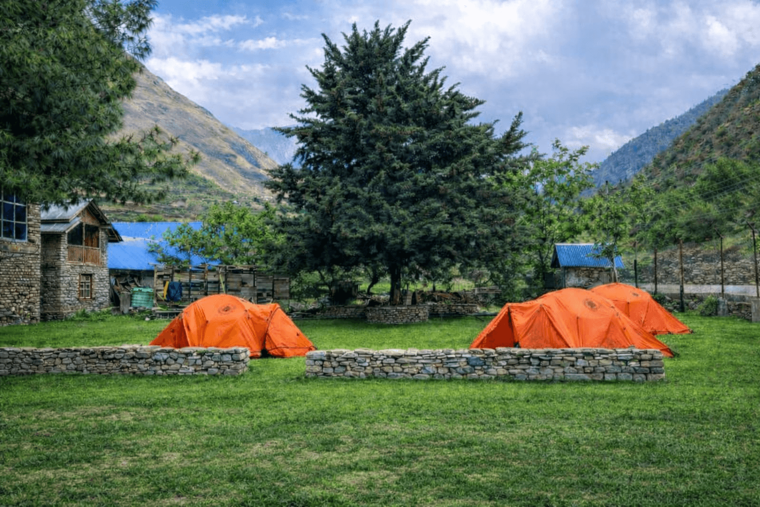 Camp surrounded by beautiful trees and natural garden landscape with stunning mountain views